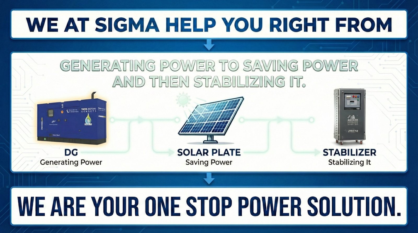 Since 1994, Sigma Engineering has been helping clients achieve uninterrupted power and sustainable energy efficiency through advanced solar and power backup technologies. Our expertise spans across solar rooftop systems, diesel generators, stabilizers, and lighting solutions for residential, commercial, and industrial sectors.